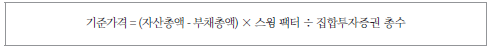 여기서 자산총액, 부채총액, 집합투자증권 총수의 정의는 기존의 계산방식과 동일하다. 스윙 팩터는 자금흐름의 방향성에 따라 달라진다. 순유입 국면에서는 순자산가치가 상향 조정되어 기준가를 인상하고, 순유출 국면에서는 하향 조정되어 기준가를 인하하는 방식으로 펀드 내부적으로 산정된다.
