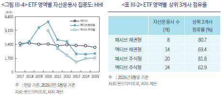 2020년 이후 상당수 자산운용사들이 액티브 주식형 ETF를 통해 시장에 진입함에 따라 액티브 주식형 ETF시장은 ETF시장 내에서 상대적으로 경쟁도가 높은 시장으로 부상했다. 액티브 주식형 ETF시장은 진입 회사 수가 24개사로 타 영역보다 많고, 상위 3개사 시장 점유율도 가장 낮다. 자산운용사 시장 집중도를 HHI로 측정한 결과 액티브 주식형 ETF시장의 집중도는 패시브 ETF나 액티브 채권형 ETF에 비해 낮으며, 빠르게 하락하는 양상을 보였다.35)