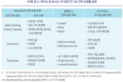 33) 여기에서는 국내 액티브 및 패시브 주식형 ETF를 2장에서 분석한 미국 주식형 ETF의 3대 전략 유형과 동일한 방식으로 분류했다. 국내 주식형 ETF의 전략 유형 분류를 위해 한국거래소(KRX)의 주식형 ETF 유형 분류를 참조하였다(<부록 표 1> 참조).