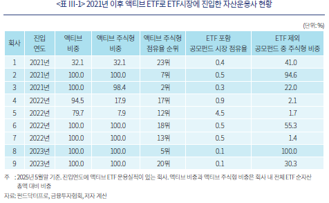 주식형 ETF의 액티브 운용이 허용된 2020년 하반기 이후 ETF시장에 진출한 11개 운용사 중 9개사가 액티브 ETF를 통해 시장에 진출했다. 이 회사들 중 6개사는 2025년 5월말 기준 전체 운용 ETF의 100%에 근접한 비중을 액티브 주식형으로 운용 중이다. 액티브 주식형 ETF의 비중이 100%에 가까운 자산운용사들은 공모펀드 전체 시장에서의 점유율이 낮지만, 주식 운용에 초점을 두고 있다.34) 이들 중 3개사는 이미 액티브 주식형 시장 점유율 상위권에 포진해 있다.