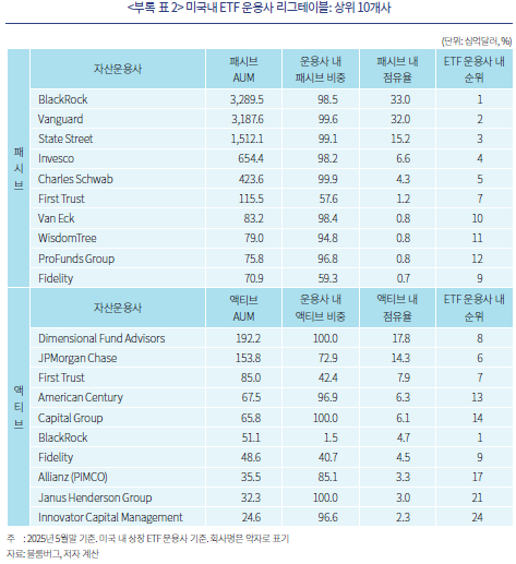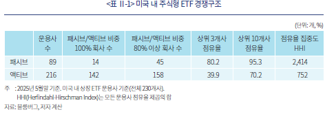 액티브 ETF시장의 경쟁구조가 패시브 ETF시장과는 다른 양상을 보이는 것도 중요한 특징이다. 패시브 ETF시장은 초대형 글로벌 자산운용사들의 주도로 투자비용 경쟁이 치열하다. 지난 2016년에 22 basis point(이하 bp)에 불과했던 미국 패시브 주식형 ETF의 자산가중평균 총비용비율(Total Expense Ratio, 이하 TER)은 2024년에 14bp까지 떨어졌다(ICI, 2025a). 즉, 미국의 데이터를 기준으로 볼 때 패시브 ETF시장은 BlackRock, Vanguard, State Street 등 3개 초대형 자산운용사들이 지배하는 집중도 높은 시장이며(<표 Ⅱ-1>), 운용자산 규모가 작아 회사 운영비용이 높은 중소규모 자산운용사들이 접근하기 어려운 시장이다. 이와 달리 액티브 ETF시장에서는 패시브 ETF를 운용하지 않거나, 패시브 ETF시장에서의 점유율이 높지 않은 자산운용사들이 점유율 상위권에 포진해 있다(<부록 표 2> 참조). 액티브 ETF시장 점유율 상위 회사들의 집중도 역시 패시브 ETF시장에 비해 낮다. 미국 내에서 액티브 ETF를 운용하고 있는 216개 자산운용사 중 패시브 ETF를 운용하지 않고 있는 회사는 142개사에 달한다. 패시브 ETF시장에 참여하지 못하고 있던 중소규모 자산운용사들이 상대적으로 TER이 높은 액티브 ETF시장의 경쟁에 참여하고 있는 것으로 판단된다.6)