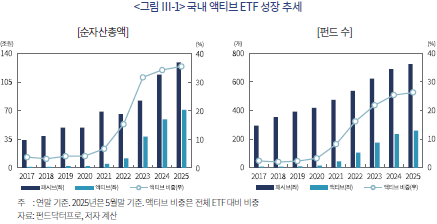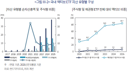 액티브 ETF 순자산총액은 주식형이 출시되기 시작했던 2020년말 2.1조원에 불과했으나 2025년 5월말에는 70.9조원으로 늘어났다. 증가율 측면에서는 글로벌 액티브 ETF시장의 성장세를 압도한다. 같은 기간 국내 ETF시장 전체 순자산총액 대비 비중도 4.1%에서 35.5%로 상승했다. 펀드 수 측면에서도 액티브 ETF의 비중은 2025년말 기준 전체의 26.3%까지 올라갔다(<그림 Ⅲ-1> 참조).