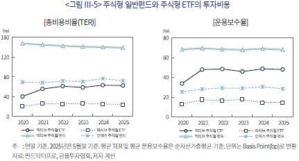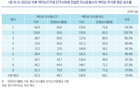 38) 이는 미국 액티브 주식형 ETF시장과 다른 특성인데, 국내 투자자들이 액티브 ETF, 테마형 ETF 등 특수 유형 ETF에 대해서는 시장대표지수 추종 패시브 ETF에 비해 보수율에 덜 민감해서일 가능성도 있다(김재칠ㆍ권민경, 2025). 또는 액티브 주식형 ETF시장이 아직 본격적인 경쟁 국면에 진입하지 않았기 때문일 수도 있다.