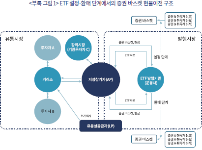 15) 증권 바스켓은 ETF 내 증권 구성비율과 동일하게 하는 비례적 바스켓(Pro-rata Basket)이 일반적이다. 커스텀 바스켓(Custom Basket)은 ETF 발행사와 AP 간 협의를 통해 증권 바스켓의 구성을 실제 펀드 포트폴리오와 다르게 할 수 있는 방식을 의미한다.