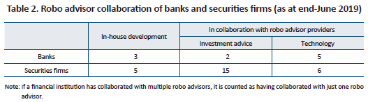 Among banks and securities firms offering robo advisory services, many of them have formed alliances with asset management firms, investment advisory firms or tech firms, though some created their own robo advisors. As seen in Table 2, three of nine banks developed robo advisors on their own. The other six banks provide robo advisors in collaboration with one or more tech firms. Furthermore, only five securities firms developed their own robo advisory platforms. The rest provide robo advisory services in collaboration with one or more asset managers, investment advisors or tech firms. Notably, three securities firms have partnered with five or more tech firms to offer stock picking robos.