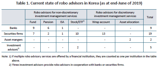 Korea has seen many robo advisors come on the market since 2016. However, unlike earlier expectations, the rise of robo advisors has not acted as a catalyst to the proliferation of wealth management services, thus doing little to contribute to the facilitation of the wealth management market. Regulation of non-face-to-face transactions involving robo advisors has been often cited as one of the reasons why robo advisors fall short of their expectations. This makes robo advisors currently in the market come down to the following characteristics: First, robo advisors focusing on non-discretionary investment management dominate the market. Second, many robo advisors are partnering with banks or securities firms. Third, there are only a few independent robo advisors. Fourth, robo advisors are widely used as distribution channels for financial products. With significant regulatory improvements in 2019, robo advisors are allowed to directly enter into discretionary investment management with their clients in a non-face-to-face setting, and to manage fund or discretionary mandate assets entrusted to them. Consequently, robo advisors are expected to better serve their intended function as a wealth management tool. This calls for securities firms to consider how to make the most of robo advisors so as to enhance their capabilities of retail financial services, keeping up in the era of digital finance.