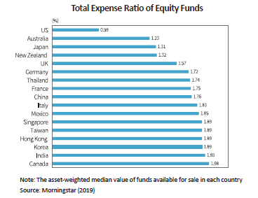 Such rigidity in distribution is also related to the high sales fees in traditional mutual funds. Large-scale financial institutions with a dominant market position have a clear incentive to give strategic backing to high-fee funds. Hence, asset management firms would want to raise their funds’ sales fees, so that they expect their funds to be sold more by large-scale distribution channels. This is how rigidity in distribution leads to higher costs for investors in traditional mutual funds. According to Morningstar (2019), the asset-weighted median value of the total expense ratio of equity funds available for sale in Korea stood at 1.89%, which is higher than major developed countries and the highest among Asian Region Funds Passport participants such as Australia, Japan, New Zealand, and Thailand.5) Taking into account that sales fees account for the largest part in the total expenses of mutual funds, it’s necessary to facilitate competition in the distribution market and thus bring down investors’ overall cost burden.6)