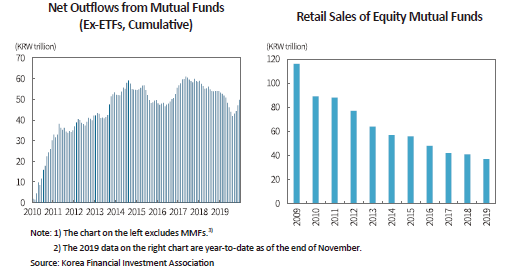 Setting aside the exchange-traded funds (ETFs), the situation seems even more drastic. Mutual funds’ net assets at year-end excluding ETFs actually shrank from KRW 207 trillion in 2009 to KRW 191 trillion in 2019.1) During the period, the net outflows from those funds amounted to KRW 57 trillion (excluding MMFs). Most of the outflows came from retail investors’ redemptions of equity funds. The retail sales of equity funds dropped a whopping 73% from KRW 107 trillion at the end of 2009 to KRW 29 trillion in November 2019.2)
