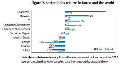 Thus far, this article took a close look at what affected the performance in 35 stock markets for eight months after the Covid-19 outbreak. It is found that after the market turmoil, stock markets in major economies are treading differentiated paths for recovery depending on the size of shocks and market-specific characteristics. According to the analysis, the recovery seems relatively faster in market with a lower decline in 2020 growth outlook, a higher weight of the IT sector, and more abundant market liquidity. Korea’s stock market meets all of those three conditions, which could have helped it record the fourth highest return among 35 nations analyzed. However, some sectors’ markedly high returns compared with global sectors require some caution. Also notable is that Korea’s sound growth outlook and solid recovery in the stock market fundamentally stemmed from its success in reining in the spread of Covid-19. At this juncture, it’s worth noting that the biggest threat to Korea’s stock market is another wave of Covid-19.