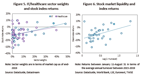 This part of the article tries to assess market-specific factors that could affect stock index performance after Covid-19 spread. The virus’s transmission quite dramatically pushed up demand for healthcare and contactless digital services, which helped bring healthcare and IT sectors to the forefront of attention. Many expect the Covid-19 pandemic to trigger an abrupt shift in the mode of economic activities away from offline towards contactless and digital. A probable assumption under the circumstances could be that stock index performance is higher in a nation with higher IT and healthcare sector weights. Figure 5 demonstrates the correlation between IT/healthcare sector weights (as of end-2019) and stock index returns from the Covid-19 outbreak up to late August. One of the findings is that the higher the IT sector weight, the higher the stock index return, which is found statistically significant. The same was also observed in the healthcare sector, but its statistical significance is somewhat limited. For the case of Korea, its IT sector weight stood at 37%, marking the second highest after Taiwan among the nations analyzed. This could be one of the major drivers for the stock market rebound.