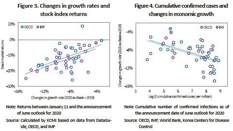 Figure 3 illustrates the correlation between the size of changes in growth rates, and stock index returns during the period between January 11 and the announcement of June outlook. The results confirmed a lower stock index return as the size of changes in growth: It is observed that a decline of 1% in growth outlook leads to a decrease of 1.5% in stock index returns. With the analysis period extending to end-August, the gaps across nations rose further: A 1% decline in growth outlook is found to bring down stock index returns by 2%. What’s notable here is that there is no evident correlation between the size of changes in growth and the lowest return after Covid-19, implying the size of real economic shocks reflected when a stock index rebounds. Also confirmed in this analysis is that market expectations for a relatively mild decline in Korea’s economic growth were behind Korea’s fast stock market recovery from the turmoil.