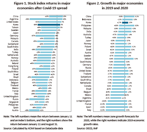 Hit hard by a synchronized plunge during the global spread of Covid-19, stock markets in major economies seem to be treading different paths depending on the size of shocks and market-specific characteristics. It is analyzed that the recovery was faster in a market with a lower decline in 2020 growth outlook, a higher IT sector weight, and more stock market liquidity. Meeting all of those three conditions, Korea’s stock market has been outperforming its peers. However, the real factor behind Korea’s solid growth outlook and quick recovery in the stock market could be the nation’s relative success in containing Covid-19. Hence, the possibility of another wave of the virus could be all the more threatening than anything else to Korea’s stock market.