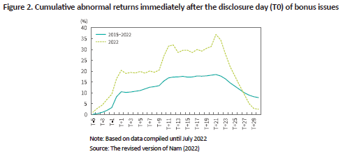 1) For more details about bonus issue-related thematic stock phenomenon, see Nam, G.N., 2022, Bonus Issues Turning into Thematic Stocks and Role of Informed Traders, Korea Capital Market Issue Paper 22-21.