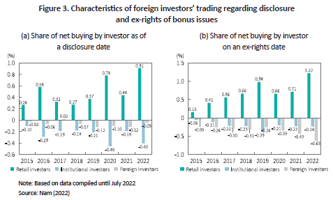 In Korea’s stock market, foreign investors also play a role as informed traders in a phenomenon where a company’s shares turn into thematic stocks after suffering an excessive price hike without any change in intrinsic value. More recently, the issuance of bonus shares by listed companies is a prime example of thematic stocks.1) Most bonus shares are issued as a one-time event to grab the attention of retail investors, which is well demonstrated by the fact that their prices that soared on the disclosure and ex-rights dates2) declined to the original level in a short period of time (Figure 2).3)
