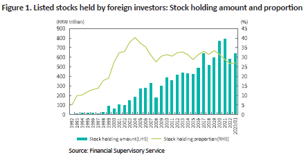 According to the Financial Supervisory Service (FSS), foreign investors made net purchases of listed stocks worth KRW 6.1 trillion in January 2023 alone, driving up their holding amount to KRW 635.9 trillion. Despite the net buying trend in January, their stock holding proportion represents 26.9% in Korea’s stock market, reaching the lowest level since 2000. The proportion of foreign investors’ stock holding rose sharply from the 1992 opening of Korea’s capital markets to foreigners until the early 2000s before experiencing a decline, and has shown a downward trend once again since 2019 (33.3% as the stock holding proportion) (Figure 1).