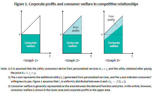 What happens if Company 2 is also able to provide personalized services? If these services of Company 2 are priced lower enough to compensate for the risk associated with data breaches, consumers may be incentivized to purchase from it.2) Graph 3 illustrates the distribution of corporate profits and consumer welfare in this scenario. Compared to Graph 2, overall social welfare remains unchanged, but the allocation between consumer welfare and corporate profits has shifted. Whether consumer welfare increases or decreases depends on the competitiveness of Company 2. The greater the new competitor’s capability to manage private information and the lower the consumer harm caused by data breaches, the greater the potential increase in consumer welfare. On top of that, the larger the proportion of utility derived from personalized services relative to the common value (v), the greater the welfare gains from the new competitor’s market entry. This underscores the need for establishing flexible entry barriers that account for the characteristics of services, rather than uniformly imposing high entry barriers.