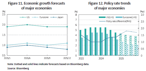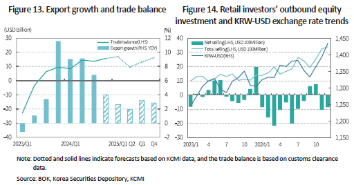 On the domestic front, downward pressure on the Korean won is also expected to persist in 2025. Notably, a potential sharp slowdown in Korea’s export growth, fueled by shifts in US trade policy, alongside sluggish domestic economic conditions is likely to keep the KRW-USD exchange rate elevated throughout the year. However, given that heightened domestic uncertainty is less likely to have a fundamental impact on exchange rate movements, these uncertainties are anticipated to subside in the second half of the year, contributing to a stabilization of the KRW-USD exchange rate. Furthermore, the inclusion of Korean government bonds in the FTSE World Government Bond Index (WGBI) is expected to attract capital inflows8) in the latter half. Meanwhile, conditions in residents’ outbound equity investment will likely incentivize the liquidation of foreign equity holdings, creating more favorable conditions for the KRW-USD exchange rate.