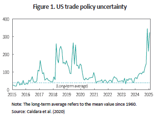 Taken together, the recent export slowdown and weakening consumer sentiment are expected to constrain private consumption recovery in the first half of 2025. In contrast, the effects of monetary easing are likely to become more pronounced in the second half of the year, gradually improving consumption conditions. However, it should be noted that heightened trade policy uncertainty following the second Trump administration could further disrupt Korea’s export conditions with a lag (Figure 8), posing additional downside risks to private consumption through export channels. This calls for close monitoring of the potential amplification of US trade policy uncertainty and its broader economic implications.