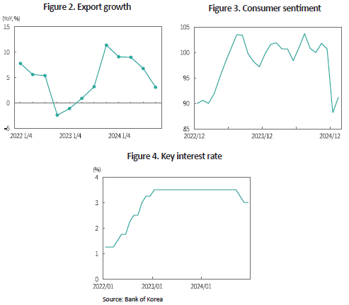 With export-driven growth anticipated to weaken in 2025, the recovery of private consumption will emerge as a key determinant of Korea’s economic growth trajectory. Among the primary factors affecting private consumption, exports and consumer sentiment are likely to exert downward pressure, whereas monetary policy is expected to provide support. Specifically, the slowdown in export growth (Figure 2) is likely to constrain household income. In addition, heightened external uncertainty following the inauguration of the new Trump administration, combined with Korea’s increased domestic uncertainty, will likely dampen consumer sentiment (Figure 3), further weighing on private spending. In contrast, the interest rate cut cycle initiated in the fourth quarter of 2024 is projected to expand household consumption capacity and incentivize spending over saving. The dynamic effects of these conflicting forces warrant a close examination of the potential for a private consumption recovery in 2025.