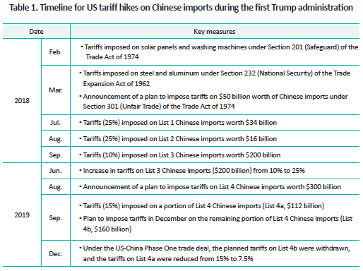 In his first term, President Trump imposed tariffs on solar panels, washing machines, steel, and aluminum, while progressively expanding tariff coverage on Chinese goods through four phases (see Table 1). At the time, the administration escalated trade disputes aggressively, leveraging them as bargaining tools to secure concessions from trading partners. By engaging in steel-related disputes, the US renegotiated free trade agreements with South Korea, Canada, and Mexico. Against China, the administration phased in tariff hikes on Chinese imports, ultimately leading to the signing of the Phase One trade deal, which required China to increase its purchases of US exports. Similarly, the recent executive orders targeting Canada and Mexico have been used to reach agreements on issues such as illegal immigration and drug control.2) Notably, the 10 percentage point tariff increase in Chinese imports, which is deemed relatively moderate, may be interpreted as the administration’s intention to leave room for a Phase Two trade deal.