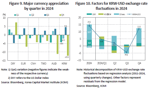Considering these internal and external factors, the KRW-USD exchange rate is likely to experience heightened volatility relative to other major currencies in the first half of 2025 before gradually stabilizing in the second half. While conditions for a weak won are expected to persist, supported by the sustained US dollar strength and Korea’s economic slowdown, downward pressure on the currency is likely to ease somewhat in the second half as domestic uncertainty diminishes. Nonetheless, given that the strength of the US dollar prevails globally, the KRW-USD exchange rate is projected to exhibit downward rigidity throughout the year. Furthermore, if domestic uncertainties like the recent political turmoil persist for an extended period, they could amplify depreciation pressures on the won, potentially triggering abrupt volatility spikes. This highlights the need for Korean policymakers to take proactive measures to avoid risks associated with excessive exchange rate fluctuations.