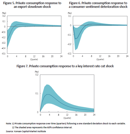 Figures 5 to 7 present the impulse responses of private consumption to a slowdown in export growth, deteriorating consumer sentiment, and key interest rate cuts.5) The analysis reveals that a shock to export growth induces the sharpest contraction in private consumption within the same quarter, with significant effects persisting into the following quarter. A consumer sentiment shock reaches its peak impact after one quarter, before gradually fading by the third quarter. Conversely, interest rate cuts have the strongest consumption-boosting effects three to four quarters after implementation. Although these effects weaken gradually over time, they remain significant for an extended period. In summary, slowing export growth and worsening consumer sentiment lead to an immediate decline in private consumption, while the stimulative effects of rate cuts unfold with a longer time lag.