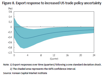 5) For this analysis, a block-exogenous vector autoregression model was employed to estimate impulse response functions. The model includes the US trade policy uncertainty index, Korea’s export growth, Korea’s private consumption growth, Korea’s consumer sentiment index (log-transformed), and the call rate as endogenous variables. Dummy variables during the global financial crisis as well as the Covid-19 pandemic are added as exogenous variables.