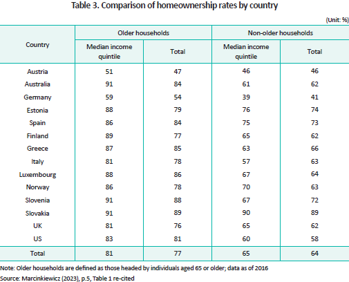 The predominance of owner-occupied housing in the asset portfolios of older households is not unique to Korea. This trend is widely observed across many countries. According to Marcinkiewicz (2023), the average homeownership rate among households headed by individuals aged 65 and over is approximately 77% across the countries analyzed,8) substantially higher than the 64% observed among those under age 65. A strong preference for homeownership in later life is also evident in Europe, Australia, and the US. Elevated homeownership rates are found across all income quintiles (OECD, 2013).9) In most countries, excluding the US, owner-occupied housing accounts for 60% to 80% of total household assets, with higher proportions generally observed among older households (Lu et al., 2020).10)