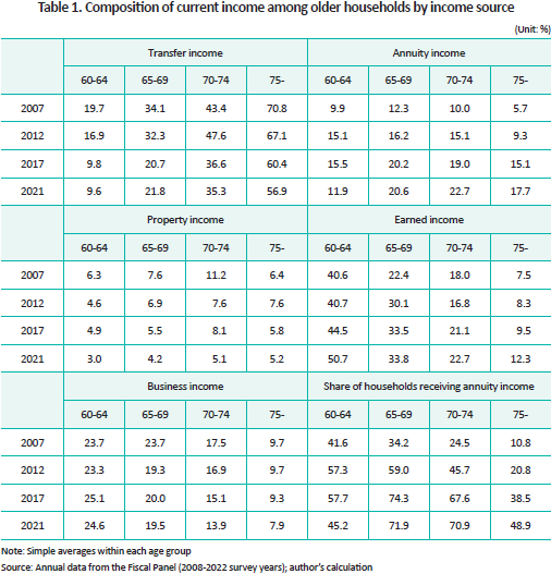 Second, it is estimated that the majority of pension income for older households is sourced from the National Pension scheme, while corporate retirement pensions and private annuities made relatively limited contributions. As presented in Table 1, the proportion of older households receiving annuity income has increased substantially over time. For example, in 2021, 70.9% of households with heads aged 70–74 and 48.9% of households headed by those aged 75 and older were reported to receive annuity income, a marked improvement compared to previous years. Nonetheless, this increase primarily reflects expanded coverage under the National Pension scheme. Given that corporate retirement pension plans only gained broader adoption in Korea after 2010, the majority of today’s older households has likely received lump-sum severance pay. Furthermore, the proportion of older households holding private annuity plans remains extremely low, with only 2.4% of individuals aged 70–74 and 0.6% of those aged 75 and older as of 2021. Consequently, income from private annuity plans represents a marginal component of older households’ income portfolios.