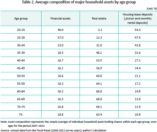 Table 2 illustrates the composition of household assets by age group. The share of real estate in total household assets steadily increases with age, reaching a peak of 69.1% among those aged 70–74. This pattern reflects a lifecycle trend in asset accumulation and spending. In Korea, younger households accumulate financial assets while securing housing through lease arrangements such as jeonse (lump-sum deposit leases) or monthly rentals. As they age, these households tend to liquidate financial holdings and lease deposits to purchase housing. As a result, the share of financial assets in their total asset portfolio declines significantly, falling to just 16–18% as they enter the older age segment, while the majority of household wealth is tied up in residential property. This asset composition persists well into advanced age.7) Consequently, the limited financial asset holdings likely force older households to remain active in the labor market.