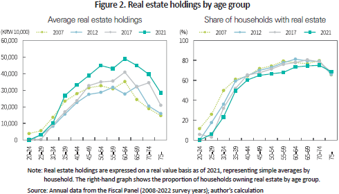 The lack of stable and consistent income streams among older households is closely linked to the heavy concentration of their assets in real estate. Figure 2 presents the average value of real estate holdings and the share of households owning real estate by age group.6) Both metrics show only a slight decline after the age of 75. For instance, the average value of real estate holdings in the 70–74 group is comparable to that of the 55–59 group. The homeownership rate peaks at 75% among the 70–74 cohort and remains as high as 68.6% even for those aged 75 and older.