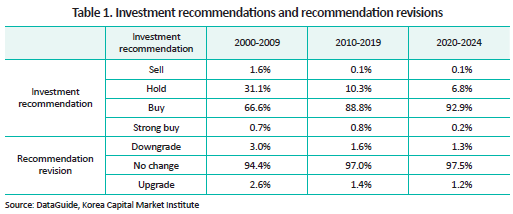Between 2020 and 2024, 93.1% of analyst reports in Korea issued either buy or strong buy recommendations, while only 0.1% advised Sell (Table 1). Although such optimism bias is observed in many countries, the skew in the Korean market has been particularly extreme in recent years. Notably, recommendation revisions are rare. Empirical evidence shows that changes in recommendations are considered more informative than ratings themselves, but only 2.5% of recommendations were revised during this period. This raises the question of whether analysts intentionally select both timing and stocks to maintain a favorable stance. However, an analysis of listed companies for which securities firms have consistently issued recommendations—at least four times annually over the past decade—reveals that buy recommendations are more pronounced and the frequency of revisions is even lower. This pattern suggests that selection bias alone does not fully account for the observed skew. If analysts issue overwhelmingly positive recommendations and rarely revise them, the information value of their reports is understandably called into question.