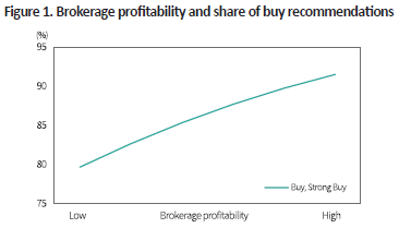 Figure 1 illustrates the relationship between brokerage profitability1) and the probability of buy (including Strong Buy) recommendations, based on all recommendations issued over the past 25 years. Controlling for other factors,2) the data show that higher brokerage profitability significantly increases the likelihood of issuing buy ratings. This finding suggests that analyst recommendations may be influenced by the brokerage business of securities firms, indicating a potential conflict of interest.