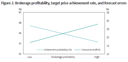 Conflicts of interest also appear to affect target prices. Figure 2 presents the relationship between brokerage profitability and both the target price achievement rate and the level of forecast errors, based on 25 years of data. Target price achievement refers to whether a stock has reached its target price at least once within the one-year horizon. After controlling for other factors, the data reveal that higher brokerage profitability is associated with lower target price achievement rates and greater forecast errors. Consistent with earlier findings, this suggests that conflicts of interest may contribute to optimism bias in analysts’ target prices.