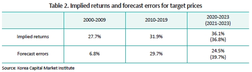 Optimism bias is also evident in analysts’ target prices. Table 2 presents the implied return derived from analyst target prices3) and the forecast error, defined as the difference between implied and realized returns. Since target prices generally represent an analyst’s one-year forward estimate of fair value, the evaluation period for returns is set to one year. For target prices issued after 2020, the average implied return stood at 36.1%, and the average forecast error reached 24.5%. In other words, despite actual realized return averaging just 11.5%, analysts predicted returns of 36.1%, suggesting a tendency toward overly optimistic target prices. When excluding 2020, a year marked by sharp price increases due to the COVID-19 pandemic, the average realized return fell to –2.9%, and the forecast error soared to 39.7%.