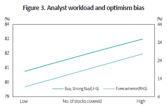 Beyond conflicts of interest, other factors may also drive optimism bias. Figure 3 examines the relationship between optimism bias and the number of companies covered by each analyst. As an analyst’s coverage increases, the likelihood of issuing a buy recommendation rises, and forecast errors in target prices become larger.4) Since negative recommendations typically require more rigorous analysis and stronger justification, analysts with heavier coverage loads may lean toward optimistic assessments. Given the ongoing decline in the number of active analysts, this finding carries important implications.