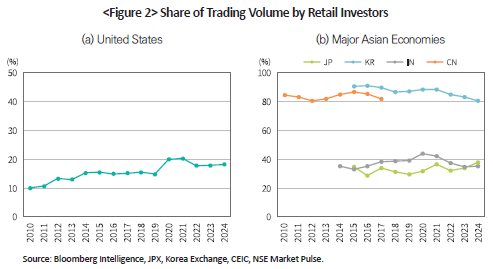 The rapid increase in retail investors since the COVID-19 pandemic has also been a major contributing factor. In the United States alone, more than 10 million brokerage accounts were newly opened in 2020, and approximately 30 million accounts were opened between 2020 and 2022.10) Moreover, in 2010, individual investors accounted for only about 10 percent of total trading volume in the U.S. stock market, but their share has since doubled to around 20 percent.. This trend of increased retail participation in equity markets has also been strongly evident in both Asia and Europe.11)