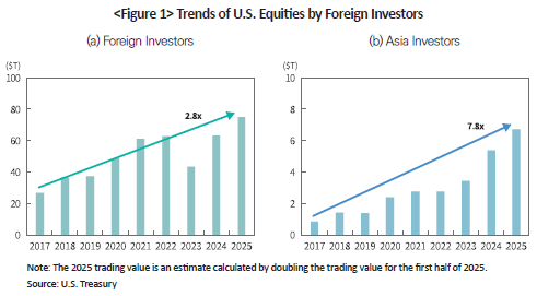 In fact, an examination of foreign investors’ trading activity in U.S. equities reveals that the total trading value in 2025 is projected to reach approximately 2.8 times the level recorded in 2017. Although foreign investor trading volume temporarily declined sharply in 2023, it rebounded quickly thereafter and is estimated to far exceed previous levels. In particular, trading by Asian investors has exhibited a particularly strong upward trend.9) It recorded the most rapid growth, with trading value in 2025 projected to be 7.8 times higher than in 2017.