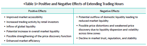 The extension of trading hours can also pose risks to market trust and reputation. If the market fails to respond promptly to changing conditions, maintain the stability of trading systems, or effectively monitor unfair trading practices, the drawbacks of longer trading hours could outweigh the benefits. Moreover, if trading hours are extended without establishing a proper staffing and supervision system for market operations and surveillance, the overall stability of the market could be at risk.16)