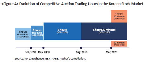 From August 2016 until March 2025, when Korea’s first alternative trading system (ATS) was introduced, the regular market operated for 6 hours and 30 minutes per day, from 9:00 a.m. to 3:30 p.m., under a continuous auction system.17) Since the launch of the ATS on March 4, 2025, only the ATS has adopted an extended 12-hour trading session, running from 8:00 a.m. to 8:00 p.m.18)