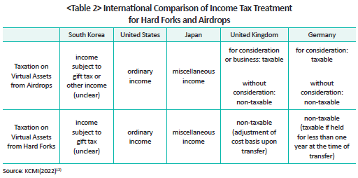 Even in the taxation of income from airdrops and hard forks, which can be considered unique tax situations specific to virtual assets, the Korean taxation system remains highly ambiguous compared to the taxation systems of major countries, as shown in the table below.