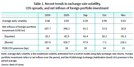 First, despite these concerns, recent indicators of external soundness have remained stable. As shown in <Table 1>, volatility has stayed relatively low even as the KRW/USD exchange rate has risen, and there have been no notable signs of stress in external credibility indicators such as Korea’s CDS spreads or foreign capital-flow dynamics. From September through November 2025, foreign portfolio investment recorded average monthly net inflows of USD 4.7 billion, while CDS premia on Korea’s Foreign Exchange Stabilization Bonds (FESB) remained stable in the low‑20 bp range.