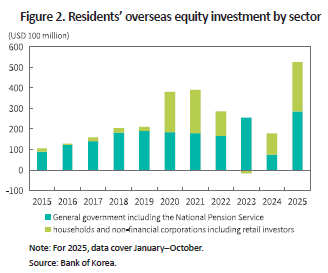 This cyclical environment appears to have amplified exchange-rate pressures in the short run by interacting with increased investment in U.S. equities amid the AI investment boom. As noted earlier, overseas securities investment has been expanding on a medium- to long-term basis (a structural trend), but in particular years the magnitude can increase sharply depending on private-sector risk appetite and exchange-rate expectations. As shown in <Figure 2>, during January–October 2025, overseas equity investment by general government (including the NPS) and by individual investors rose to unusually high levels—equivalent to 3.8 times and 2.3 times, respectively, their full-year 2024 amounts. In other words, atop the structural trend toward more overseas investment, 2025 saw a short-term concentration of residents’ overseas investment that drove a surge in dollar demand, which may have further lifted the exchange rate through short-term flows and expectations.