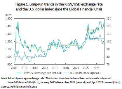 As shown in <Figure 1>, the KRW/USD exchange rate traded around an average of roughly KRW 1,150 in the pre-pandemic period (2015–2021). Since the pandemic, however, it has formed a new equilibrium range around KRW 1,350—about KRW 200 higher on average. This structural upward shift in the exchange-rate level can be understood as the result of combined external and domestic factors.