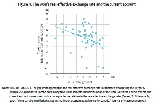 Meanwhile, while the export-stimulating effect of a weaker won has diminished relative to the past—given the increasing technology intensity of exports and the larger share of imported intermediates—it can still serve as a buffer for exports and the current account through price competitiveness. As shown in <Figure 4>, a more undervalued won tends to be associated with an improvement in the current account balance. Especially in an environment of heightened trade-policy uncertainty, exchange-rate depreciation may help offset part of the loss of price competitiveness stemming from U.S. tariff increases, thereby easing pressures for an export slowdown. For example, reflecting unit-price cuts in response to tariff increases, the automobile export price index in November 2025 fell 8.5% year-on-year in contract currency terms. In won terms, however, the decline was limited to 2.8%, suggesting that the exchange rate absorbed part of the price-adjustment shock.
