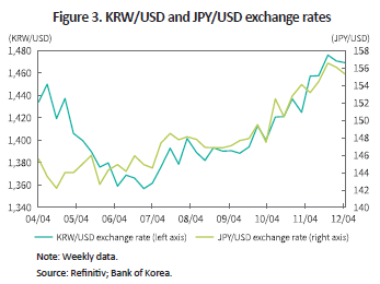 A higher KRW/USD exchange rate has both positive and negative effects: it can boost exports via improved price competitiveness, while also reducing domestic real income through higher import prices and potentially increasing financial instability. As inflation rose after the pandemic, surging import prices—especially for energy and food—added to pressures on domestic prices and consumption, amplifying concerns about the adverse effects of exchange-rate depreciation. Moreover, if the exchange rate spikes rapidly and volatility increases, confidence in the won can weaken and capital outflows may intensify, creating risks to financial stability.
