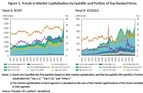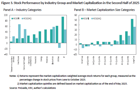 Sector performance in the second half of 2025 was characterized by a structure in which a small number of sectors led the rally. By market, the KOSPI showed overwhelming strength in IT, while the KOSDAQ recorded relatively higher returns in healthcare and industrials (Figure 3, Panel A). By market capitalization, both markets exhibited a monotonic upward pattern, with returns increasing alongside market cap size (Figure 3, Panel B). The lowest bucket remained in negative or low-return territory, while the highest bucket delivered strong gains of approximately 52% in the KOSPI and around 36% in the KOSDAQ. In the KOSPI, the index contribution of mega- and large-cap stocks strengthened, while in the KOSDAQ, gains were particularly pronounced among top-tier large-cap biotech names. As a result, performance became concentrated in the upper market-cap group, with a clear gap compared to the lower groups.