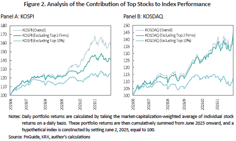 To evaluate how much the recent rise in stock prices was driven by top constituents, we compared index performance excluding those stocks (<Figure 2>). The results confirm that index returns have been highly dependent on a small number of stocks. In the KOSPI market, the cumulative market-capitalization-weighted return from June to early November was about 66%; however, excluding the top two companies, the increase over the same period falls to 40.6%. Accordingly, the contribution of the top two companies is estimated at approximately 38.5% of the total gain (=25.4%p/66%). Furthermore, when excluding the top 10% of stocks by market capitalization, the cumulative increase for the remaining group is only about 25%, suggesting that the rally did not spread broadly across sectors or stocks. The KOSDAQ market shows a similar pattern: excluding the top 10%, the cumulative increase is only 12%, indicating that the revaluation of large-cap stocks largely drove overall index performance.