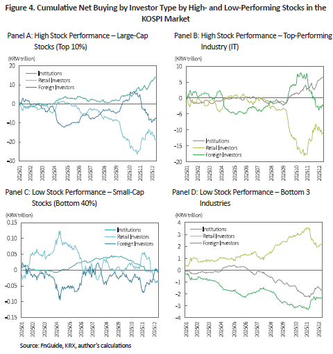 An analysis of cumulative net buying flows by investor group during the recent rally from June to November shows that retail investors exhibited a distinct contrarian tendency—net selling winners and net buying losers. In large-cap KOSPI stocks (top 10%) and the top-performing sector (IT), net purchases by foreign and institutional investors drove the rally, while retail investors consistently accumulated net sales (Figure 4, Panels A and B). In contrast, in underperforming sectors, retail investors intensified their bottom-fishing, with net purchases totaling about KRW 3.3 trillion from June to October alone (Figure 4, Panel D). Over the same period, institutions and foreign investors continuously reduced their exposure to these lower-tier sectors.