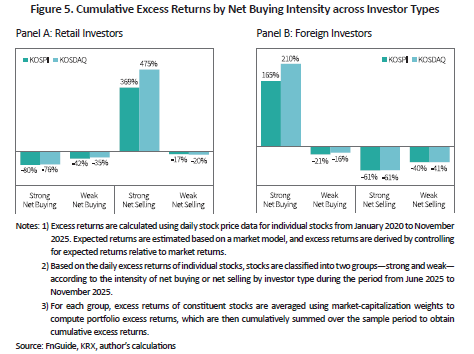 Additionally, when performance was analyzed based on the degree of individual investors’ net buying or net selling, it appeared highly likely that their contrarian tendencies contributed to underperformance. Individual investors’ daily trades were classified into net buying and net selling, and each group was further divided into strong (upper range) and weak (lower range) categories to calculate cumulative abnormal returns. The abnormal returns of stocks that individuals net bought were consistently negative (–). Conversely, stocks that individuals strongly net sold recorded significantly positive (+) abnormal returns during rally periods (Figure 5, Panel A). In other words, this suggests a recurring pattern in which the stocks individuals sold tended to rise, while the stocks they bought rose less or declined. Applying the same method to foreign investors, positive abnormal returns were observed for strongly net bought stocks and negative abnormal returns for net sold stocks, confirming a contrasting pattern in which momentum (winner-chasing) trading translated into stronger performance (Figure 5, Panel B). During the bullish phase from June to November, individual investors likely failed to achieve returns relative to the index due to their tendency to act against the prevailing trend.